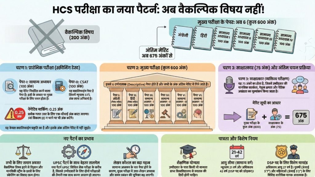 यह लेख केवल वैकल्पिक विषय हटने की बात नहीं करेगा, बल्कि उन पांच सबसे प्रभावशाली बदलावों पर से पर्दा उठाएगा जिन्हें हर गंभीर HCS उम्मीदवार को न केवल जानना, बल्कि अपनी तैयारी की रणनीति में शामिल करना भी ज़रूरी है। आइए इन नए नियमों को विस्तार से समझते हैं।