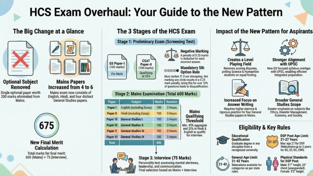 The recent overhaul of the HCS exam pattern signals a clear shift in philosophy. The exam has become a more standardized, General Studies-centric test that rewards broad knowledge, analytical ability, and consistent writing skills over deep specialization in a single subject. These changes level the playing field and bring the state exam into closer alignment with the national-level civil services examination.
